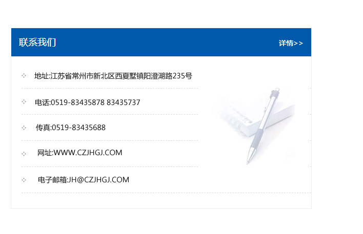 地址:常州市新北區友邦商務大廈1幢16、17層  電話:0519-85101652  傳真:0519-85112595  郵編:213022  網址:www_cz-jiayue_cn.sz-whbz.com  郵箱:xiajifengaa@163.com